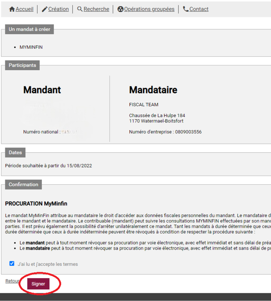 7. Acceptez les termes et conditions + cliquez sur « Signer »